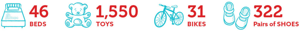 Children in foster care received essentials such as beds, clothes, shoes, baby gear, and toys.