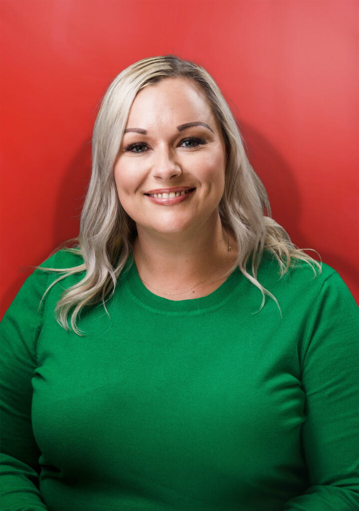 A woman in a striped shirt smiles in front of a red backdrop